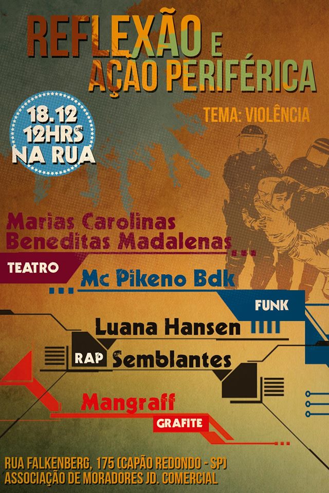 Jovens do projeto Reflexão Ativa Periférica, do Capão Redondo, convidam todos a participarem do encontro de discussão sobre a Violência na Quebrada, na próxima sexta-feira no Jardim Comercial.