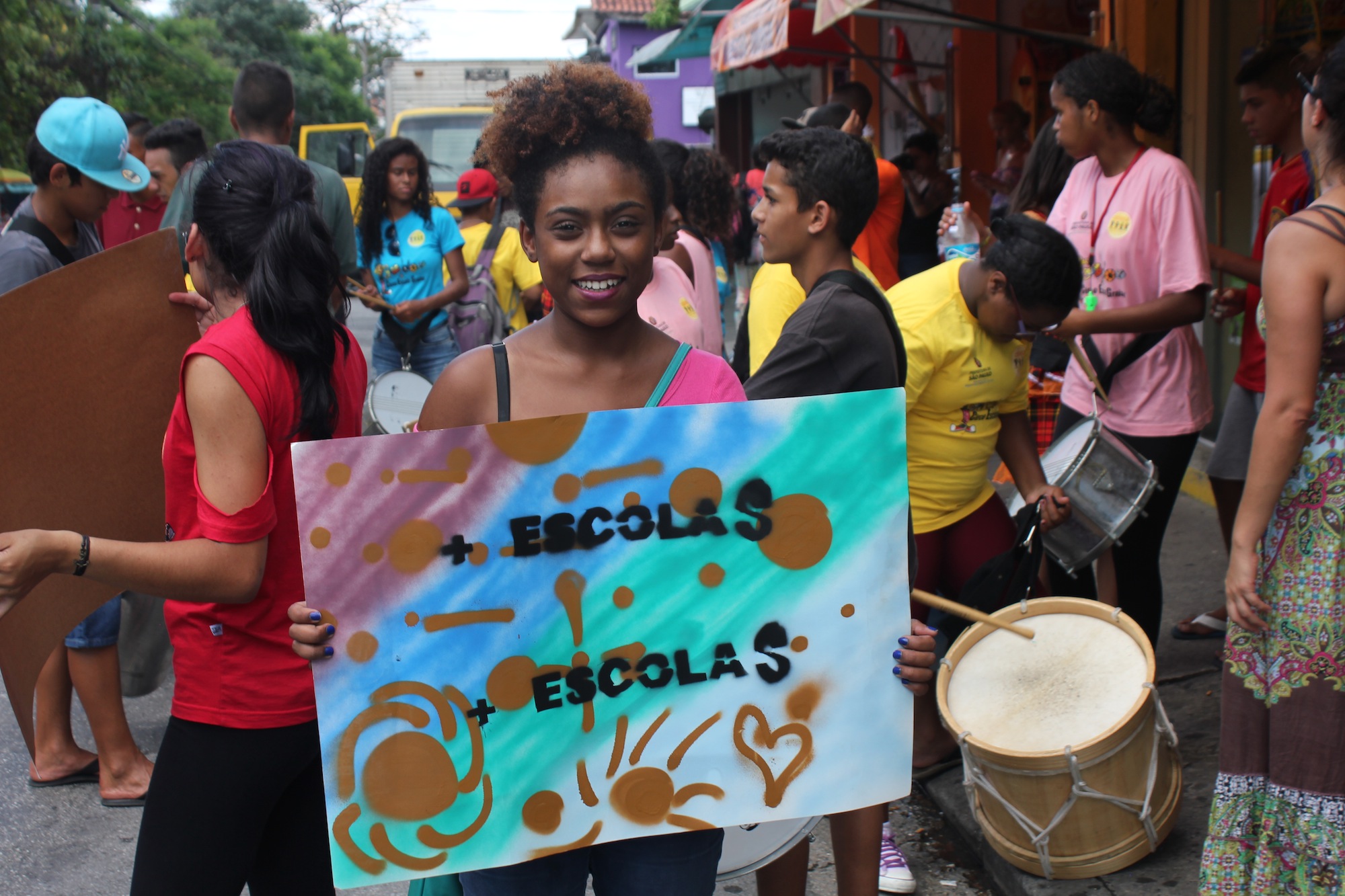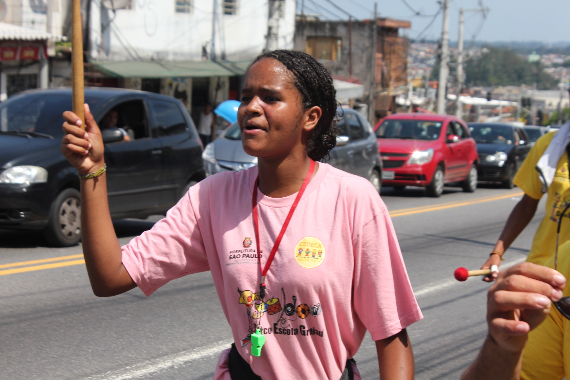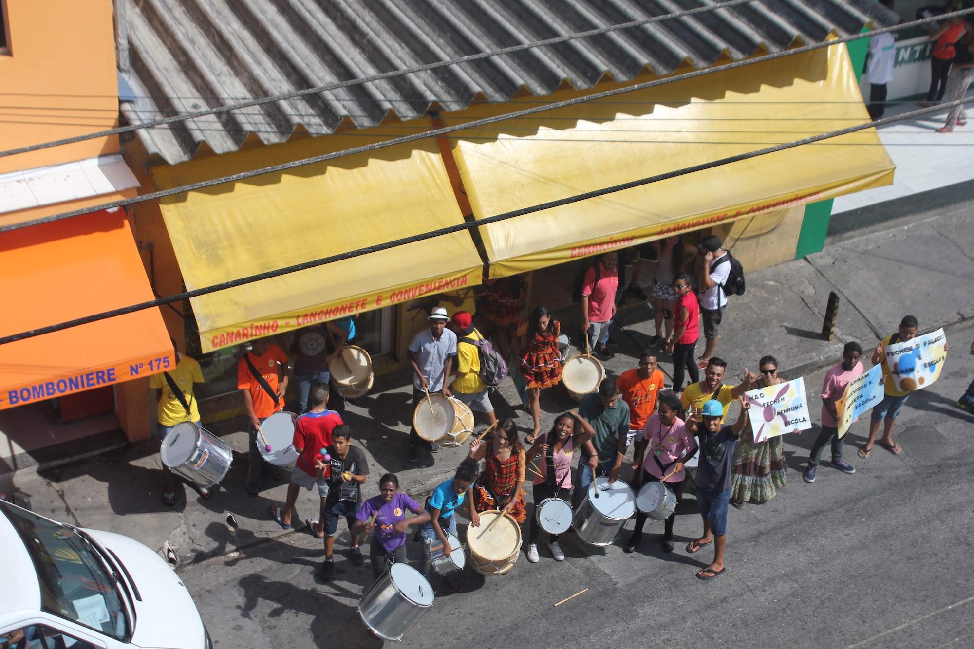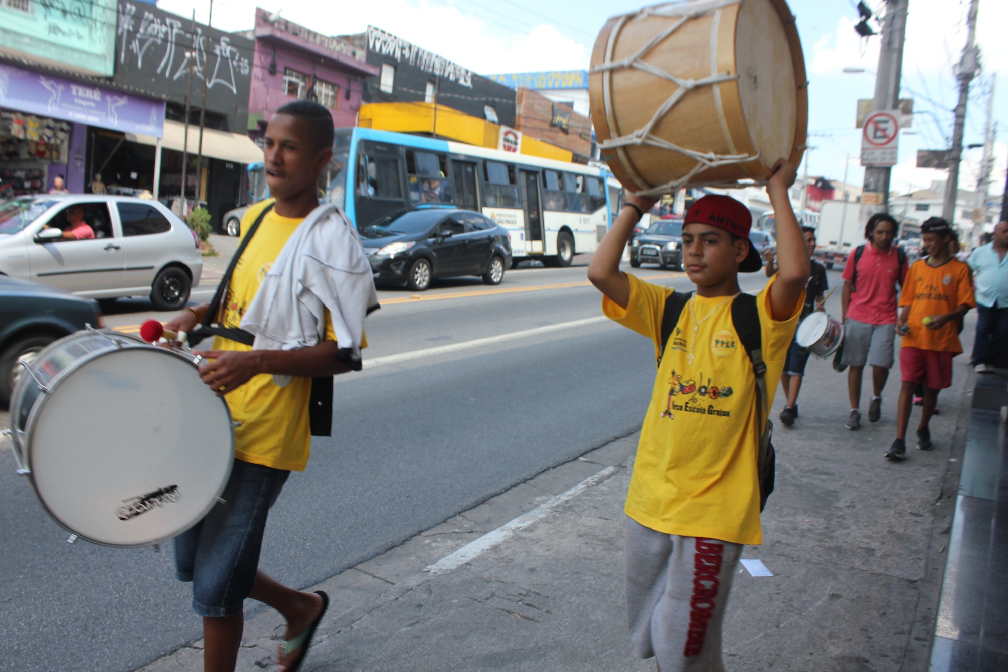 Mais de 30 adolescentes que moram no Extremo Sul de São Paulo realizaram, na tarde desta terça-feira (15/12), um cortejo pela avenida Belmira Marin, no Grajaú. Com panfletagem, cartazes e batucada, eles protestavam pelo cancelamento da reorganização escolar. O cortejo terminou em frente ao Terminal Grajaú, onde o batuque continuou, além de acrobacias.