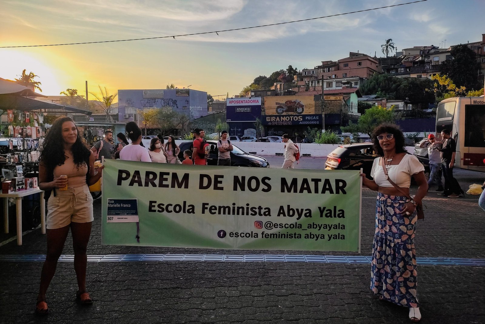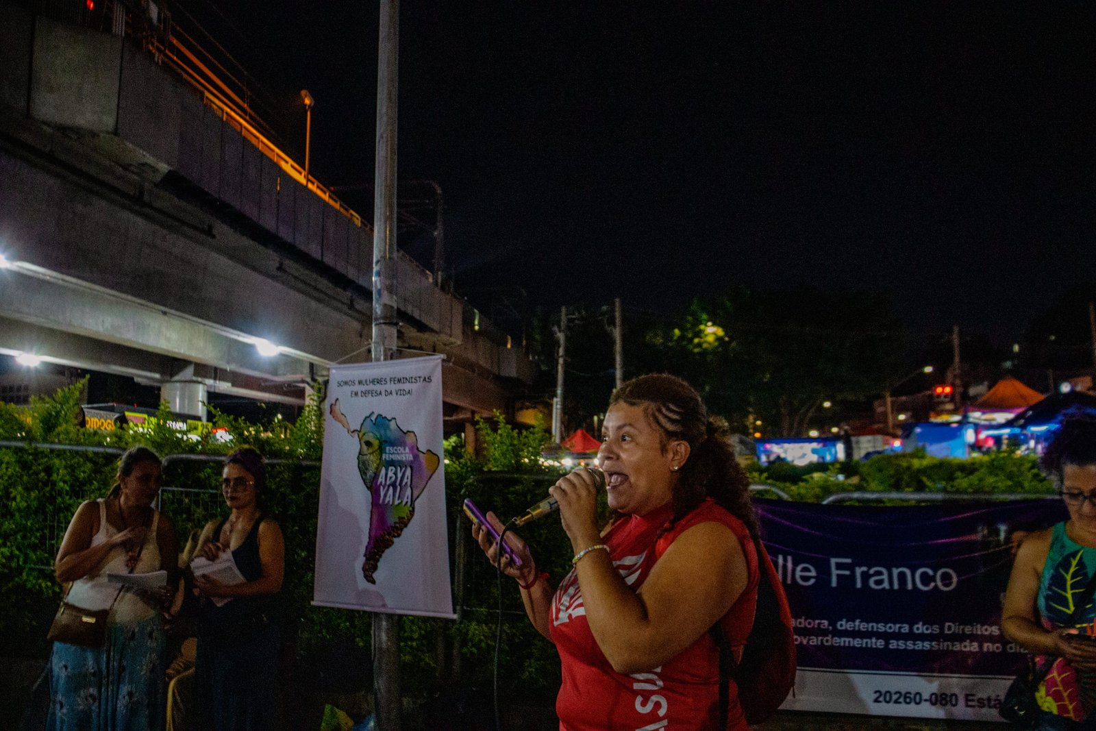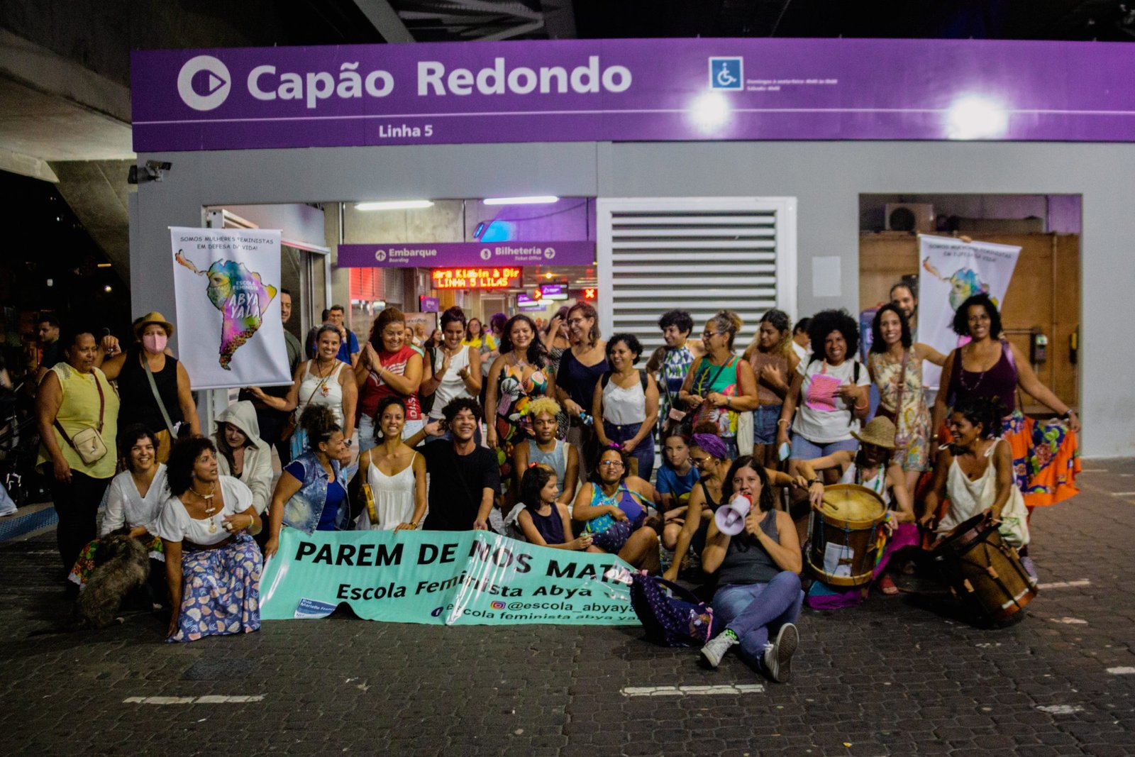 Realizado pela Escola Feminista Abya Yala, manifestação denuncia violência contra mulheres em ação que contou com música, poesia e entrega de kits de higiene pessoal para acolher passageiras no retorno pra casa