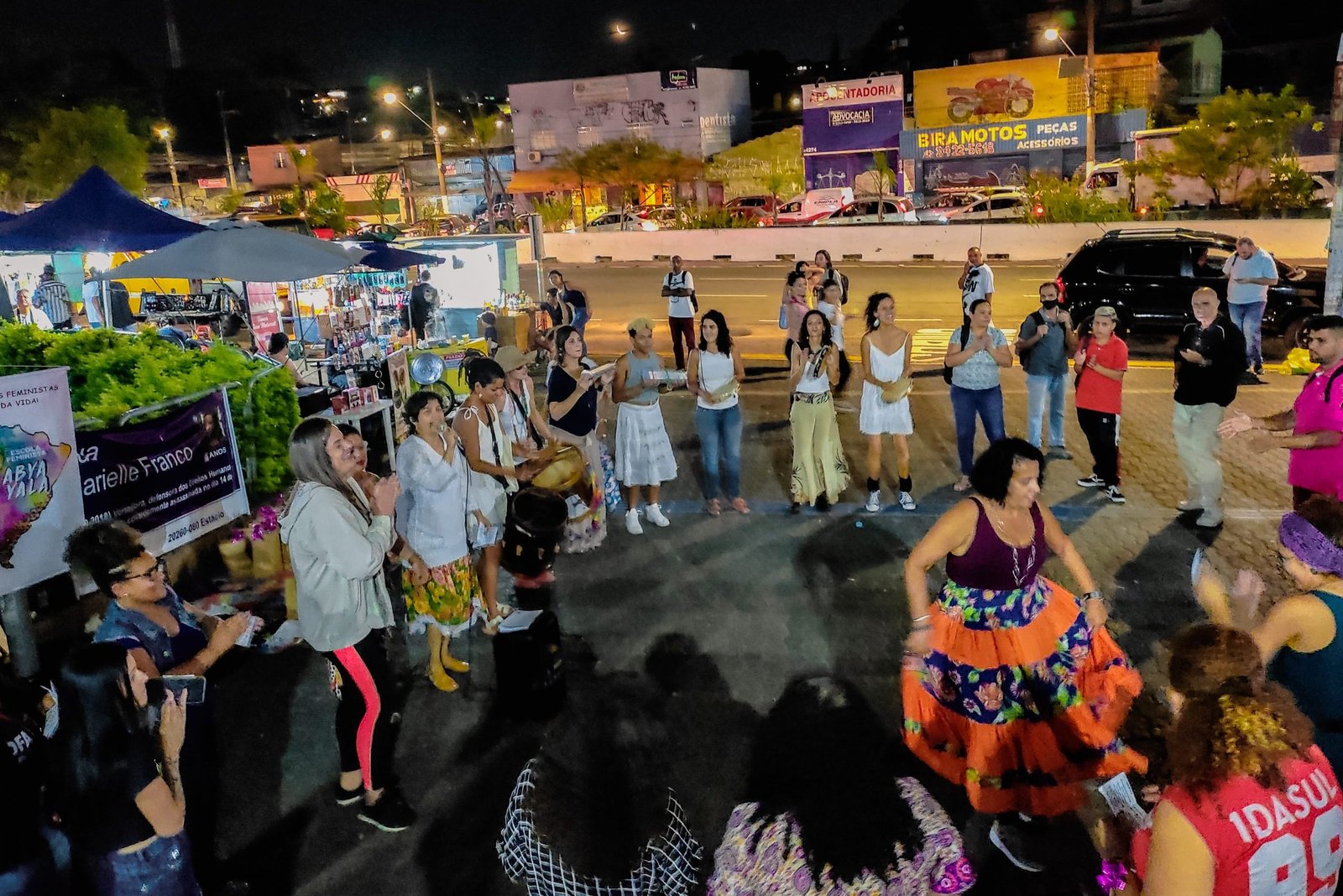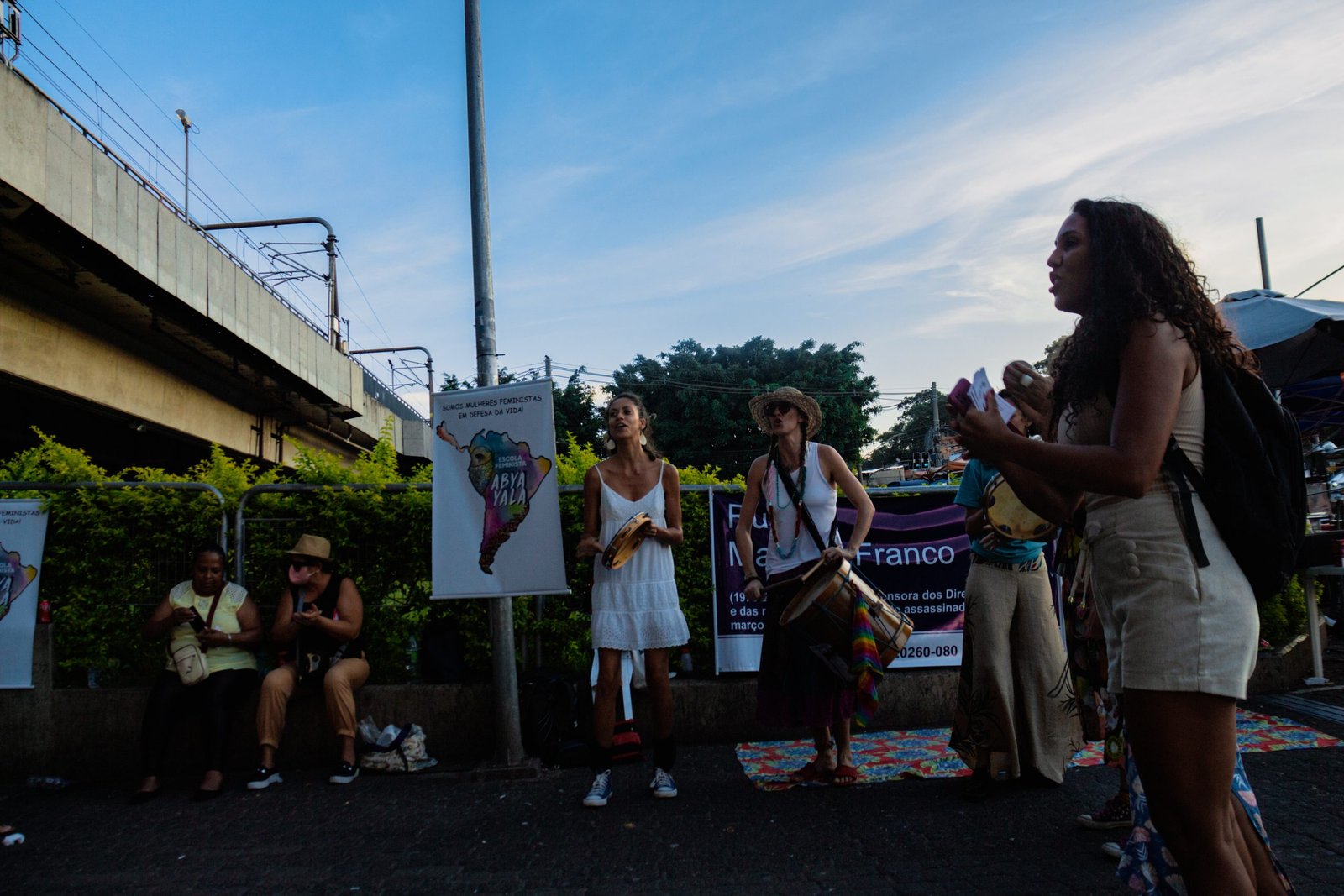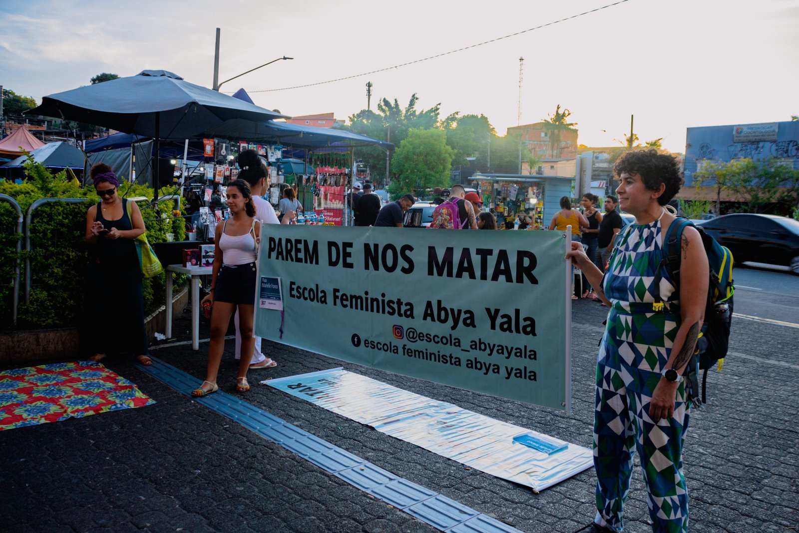 O ato poético foi promovido pela Escola Feminista Abya Yala e contou com a manifestação do grupo Coco do Bonde e a distribuição de kits de higiene pessoal.
