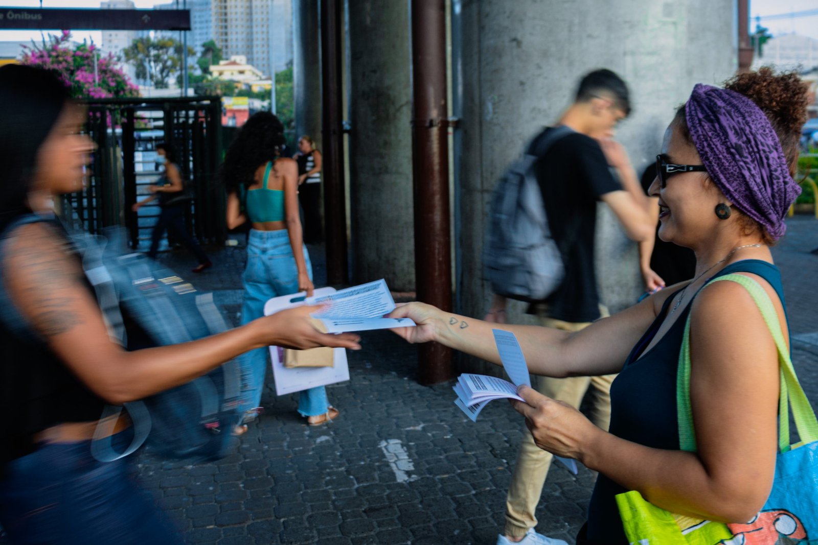 Como espaço coletivo de troca de afeto, experiências e conhecimento, a Escola Abya Yala se deslocou para onde essas situações acontecem. Com pressa ou impaciência, nem todas as passageiras pegavam o panfleto na saída da estação. Mas quando o grupo Coco de Bonde começou a tocar a releitura da música “Acorda, Maria Bonita”, o número de pessoas no ato duplicou.