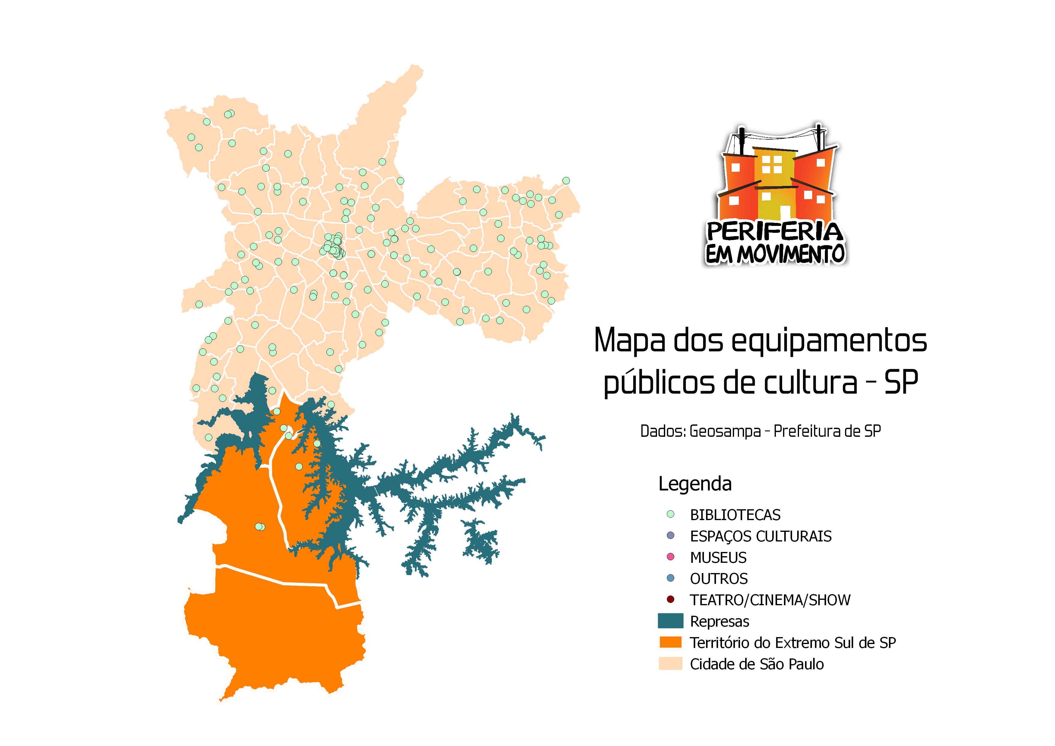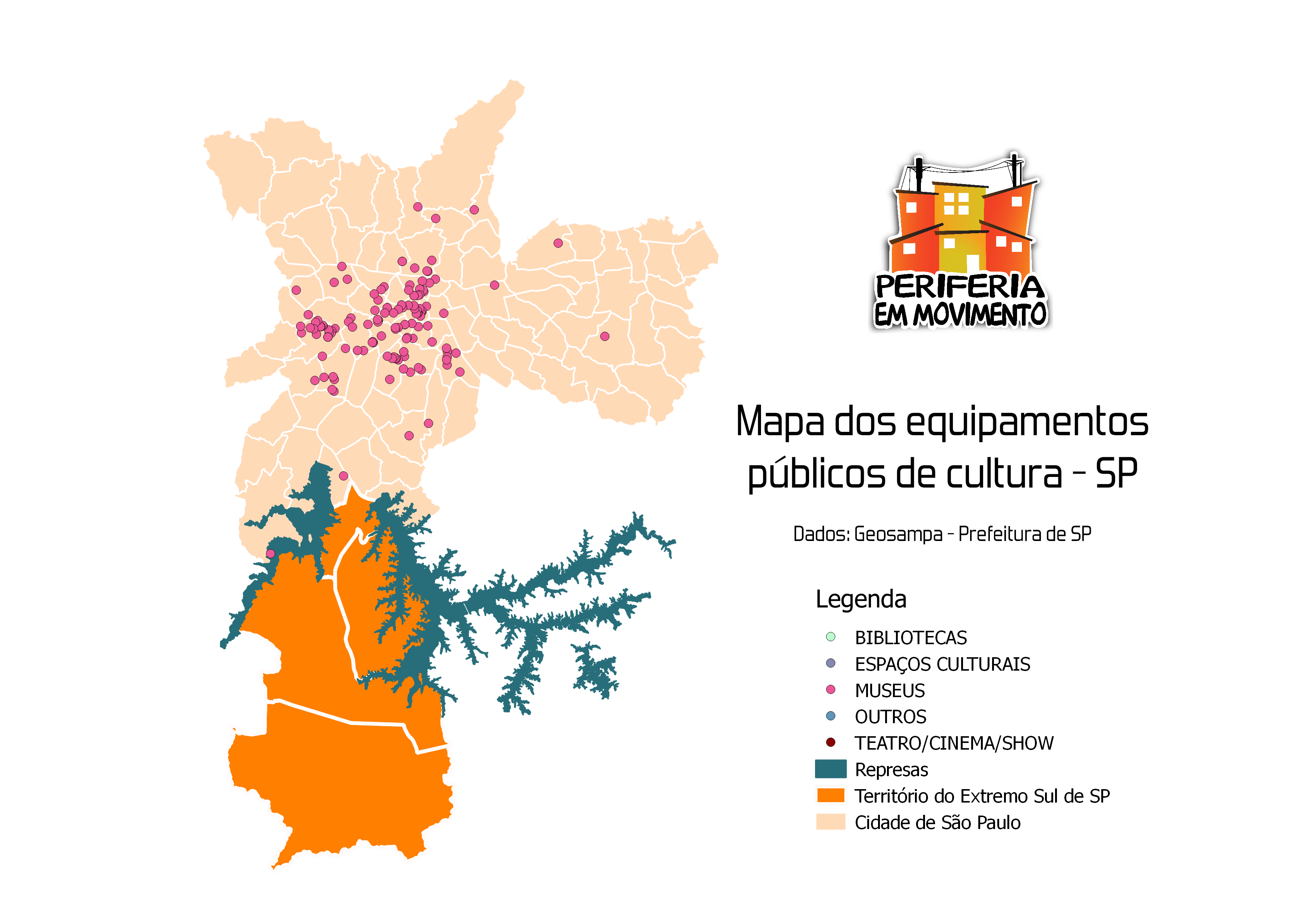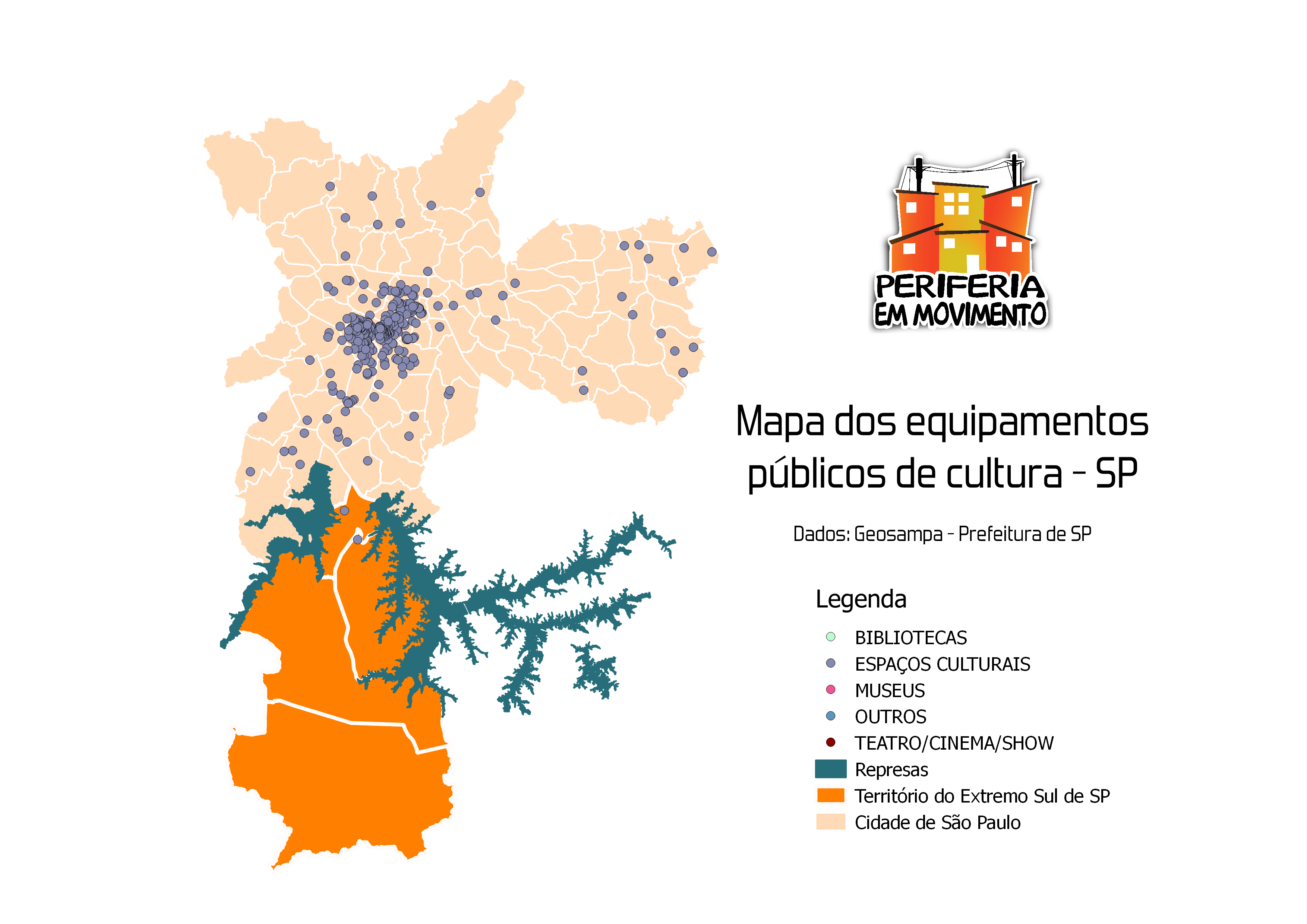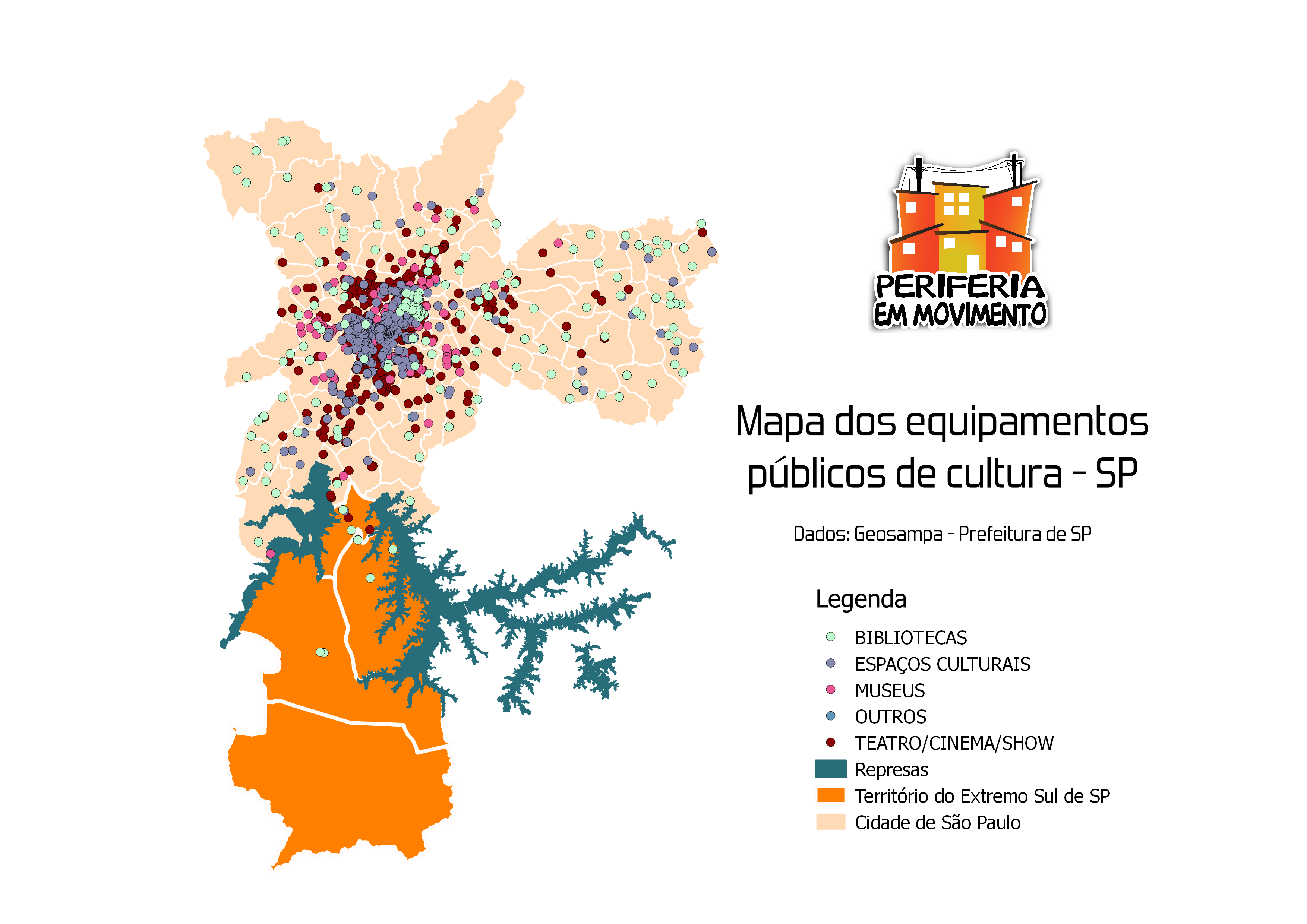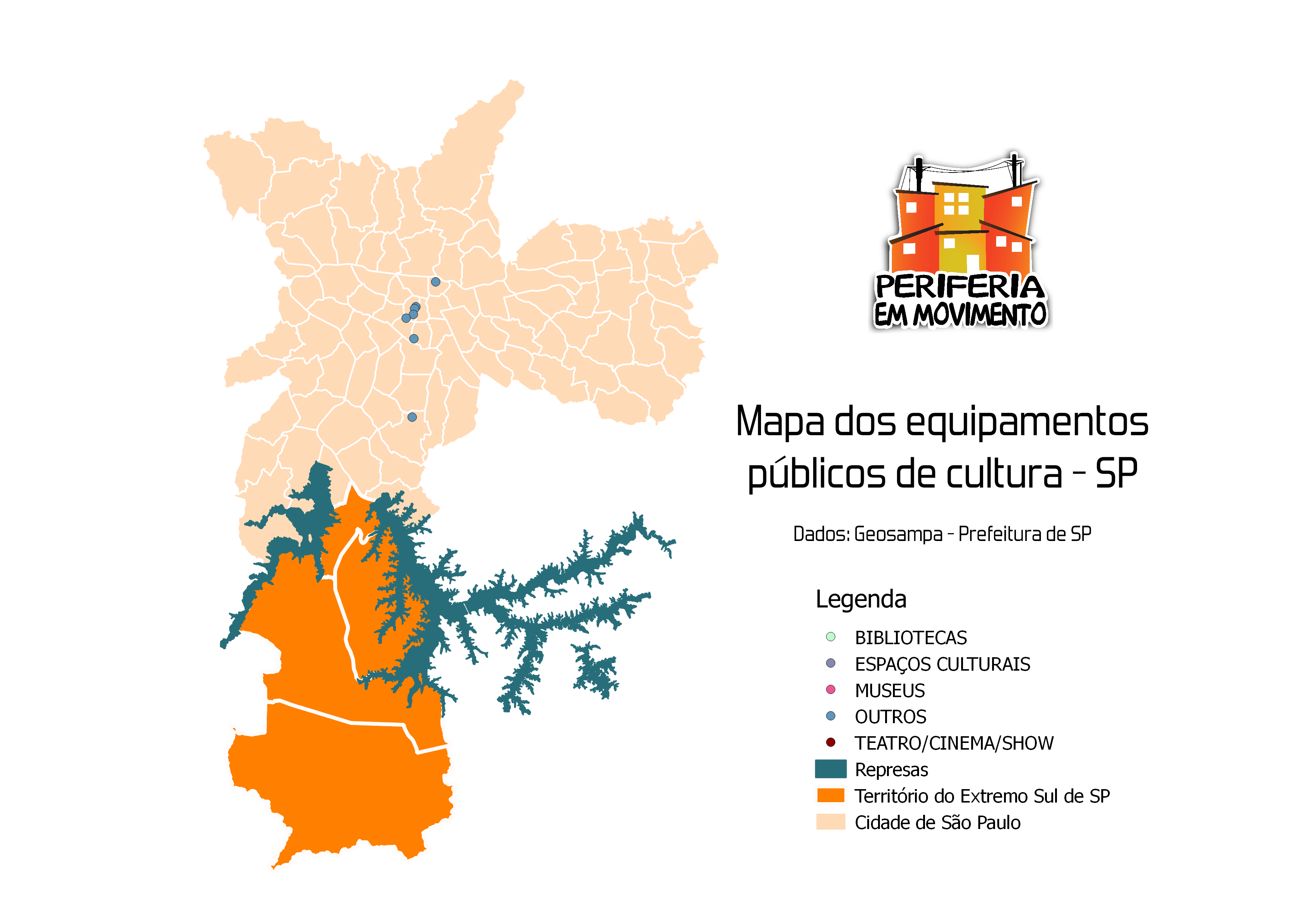 Veja abaixo a distribuição de equipamentos culturais pela cidade de São Paulo e, especificiamente, no Extremo Sul