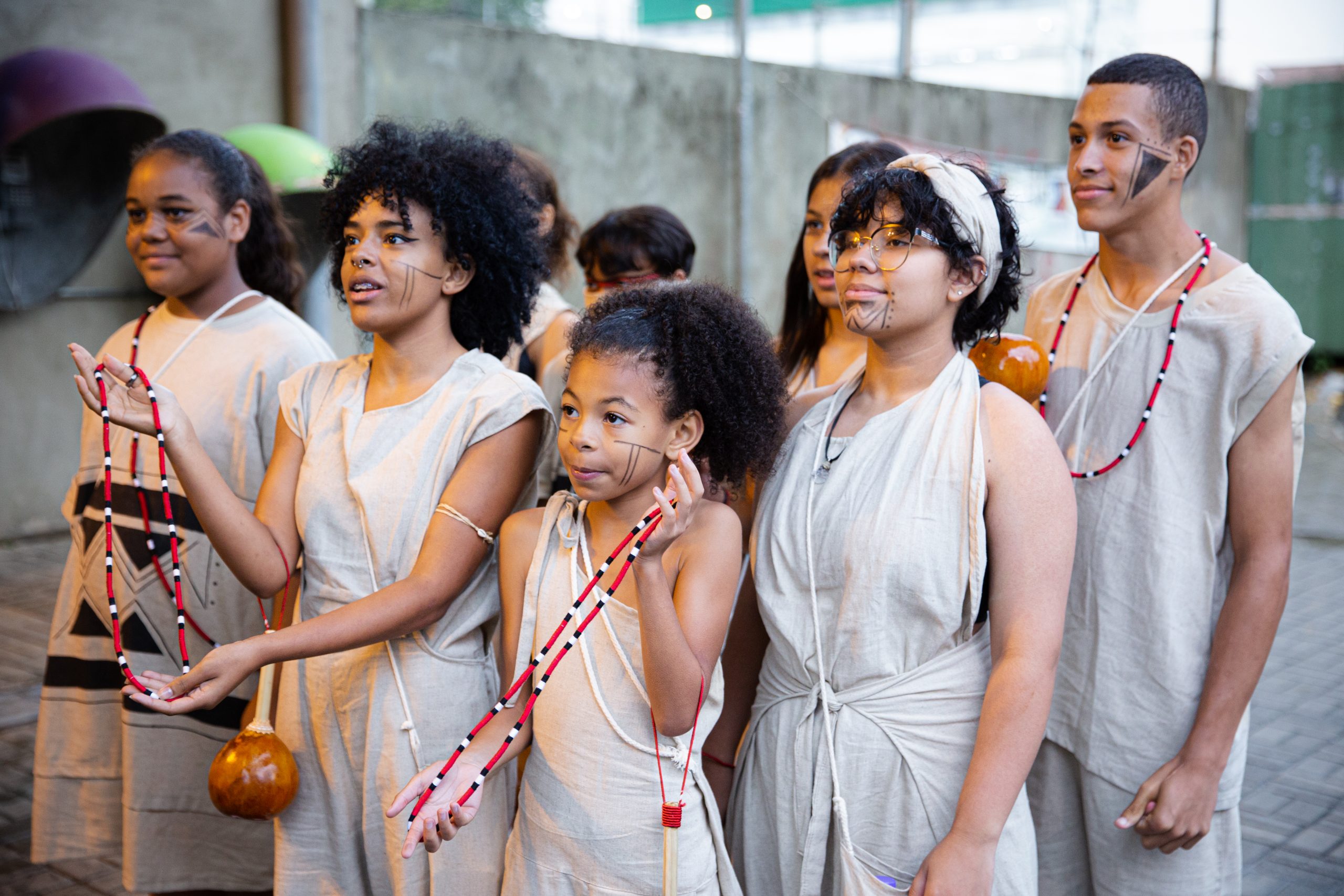Por dizer em criança, a infância na peça é levada a sério, boa parte das pessoas atuantes são crianças que brincam e encenam e colocam em dúvida nossa capacidade de elaborar linguagem com idiomas originários, nos recebem flexionando a linguagem com “sejam bem vindes!”, questionam o sistema de racialização e seguram em nossos braços para nos guiar na travessia da passarela que a cobra vermelha rasteja por baixo.