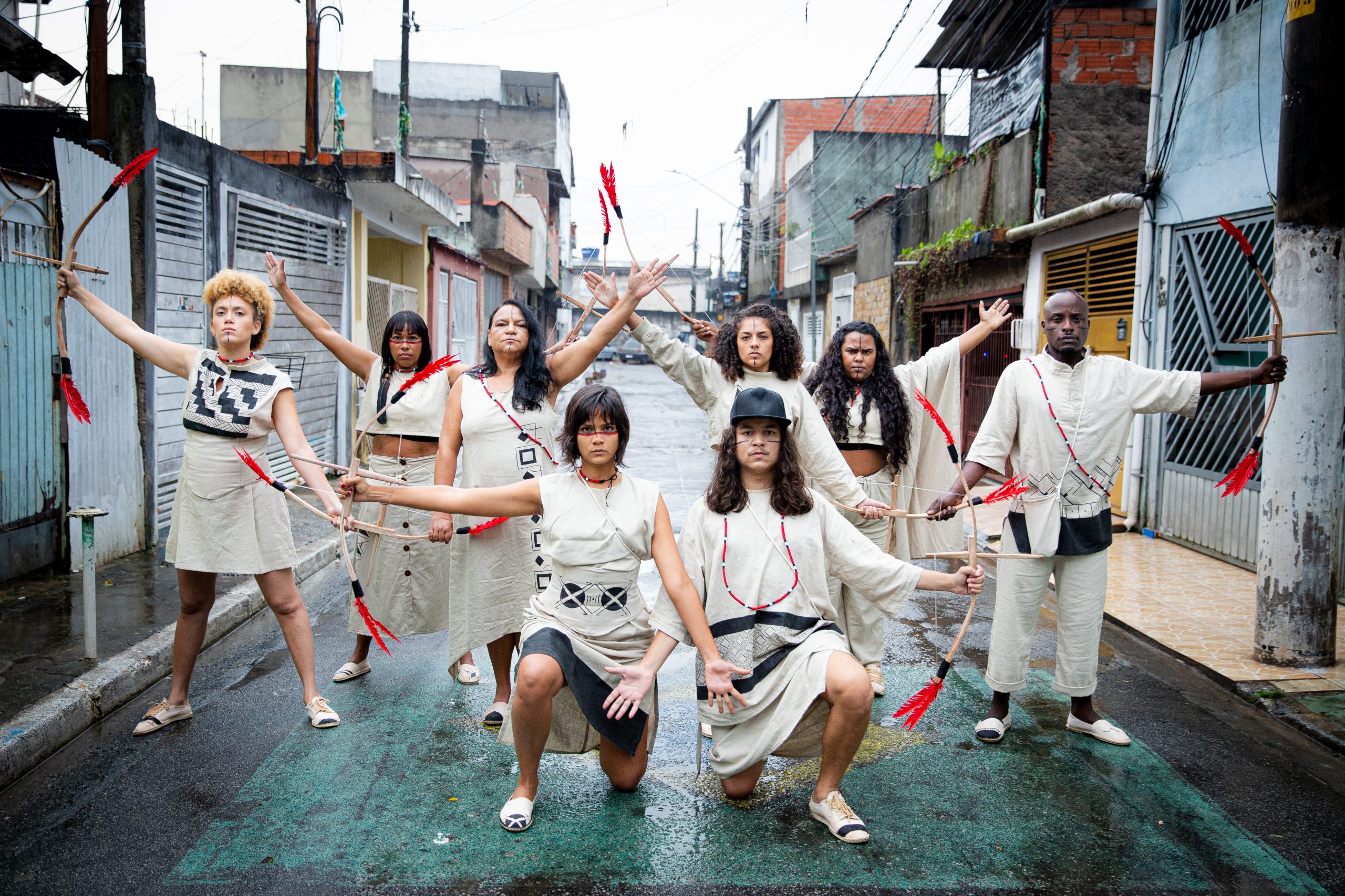 Em curso, segue um projétil de metal contra povos originários dessa terra e os trazidos de África. Em curso, segue um projétil tensionado em um arco, feito de sangue, resistência, feitiço e sonhos contra as tentativas de apagamento e aniquilação.