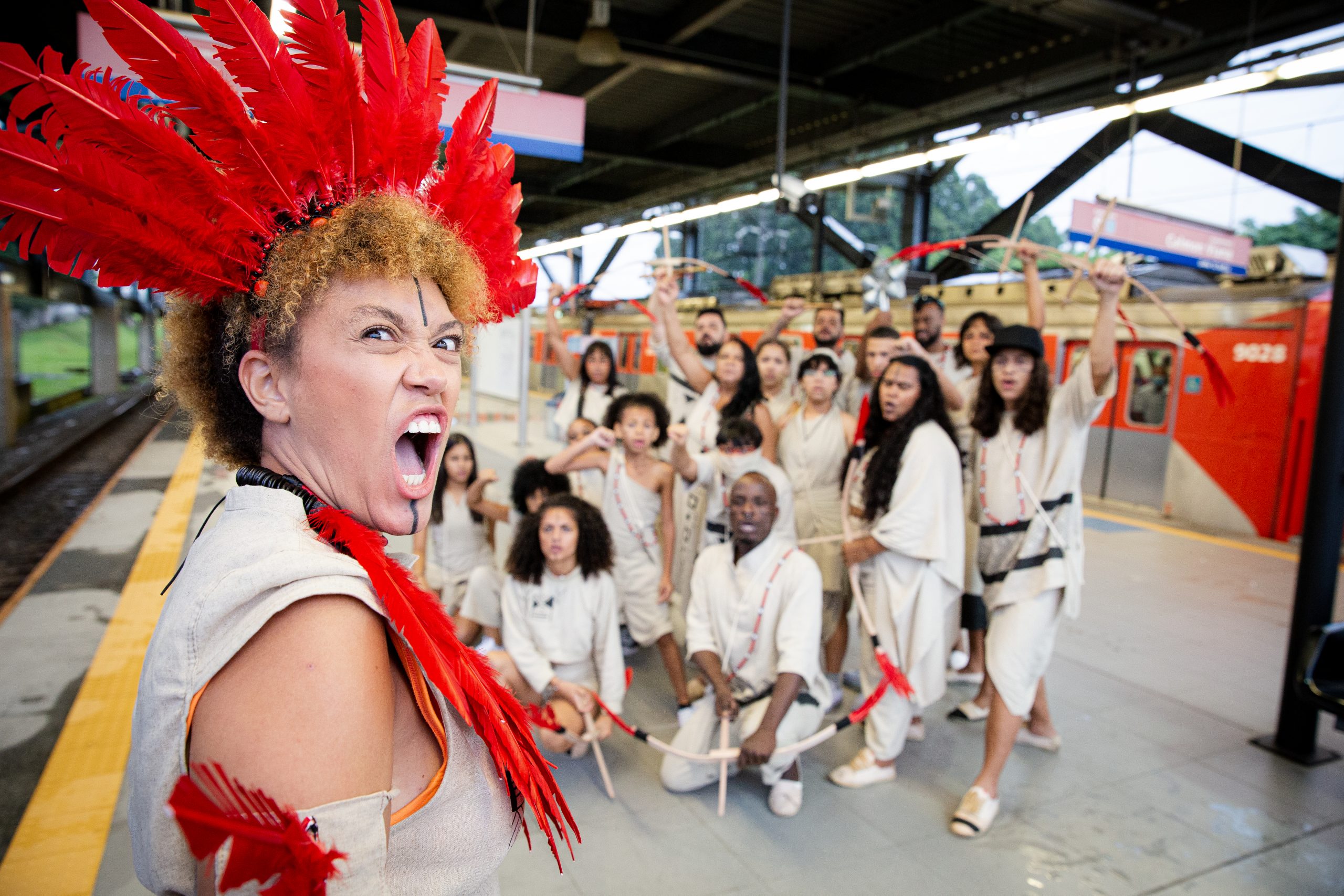 O novo espetáculo teatral do Coletivo Estopô Balaio se inicia dentro de uma cobra vermelha – o trem que percorre do Brás até o Extremo Leste de São Paulo. Ouvimos vozes anciãs e novas contarem, junto com a paisagem em deslocamento, um lugar. É Ururay, antigo aldeamento sobreposto a São Miguel Paulista, território para uma importante resistência indígena em período colonial.