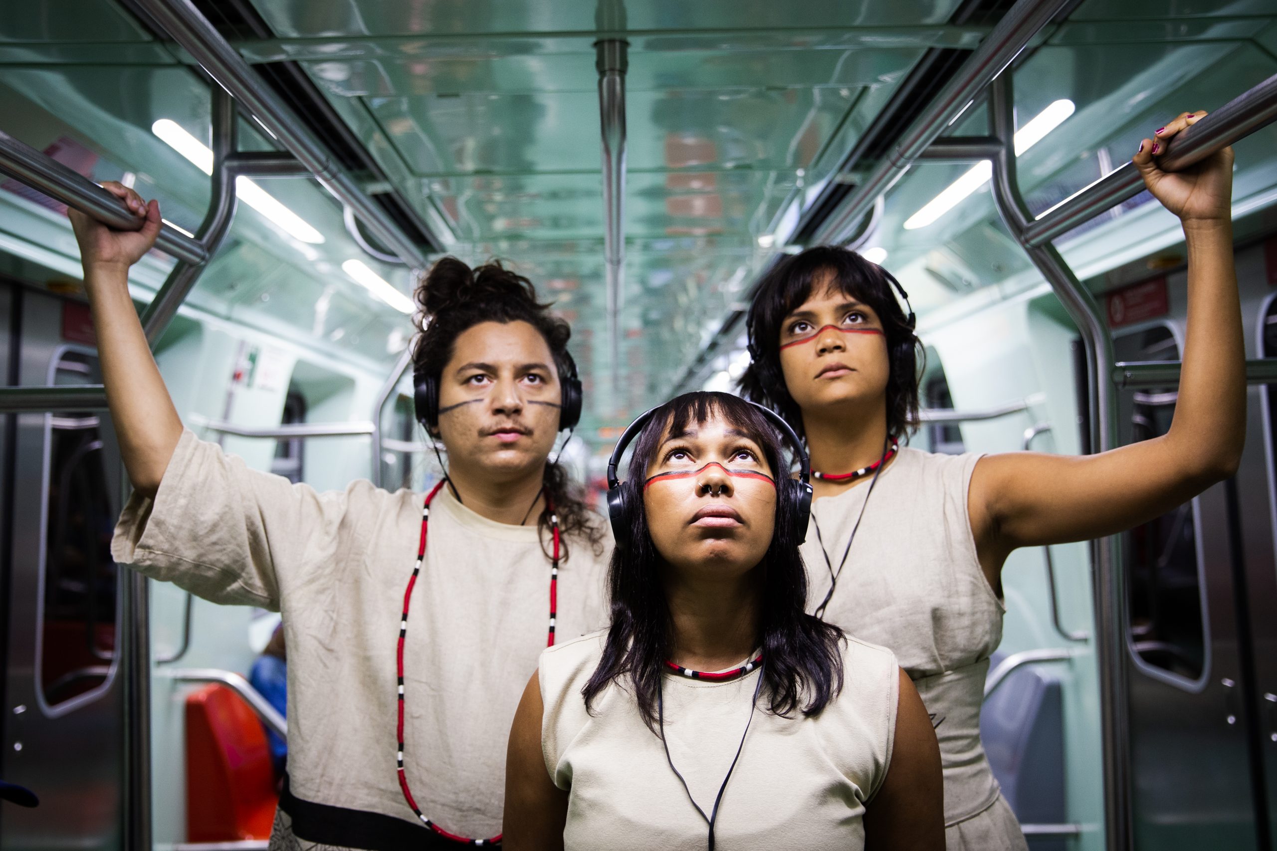 Enquanto o percurso é feito e ouvimos a descrição de onde a cobra vermelha nos regurgitará, corpos atuantes se deslocam no vagão. Quem não é espectador se torna, quem não está com os fones oferecidos pela produção observa pessoas indígenas dentro de um trem esperando chegar em um destino.