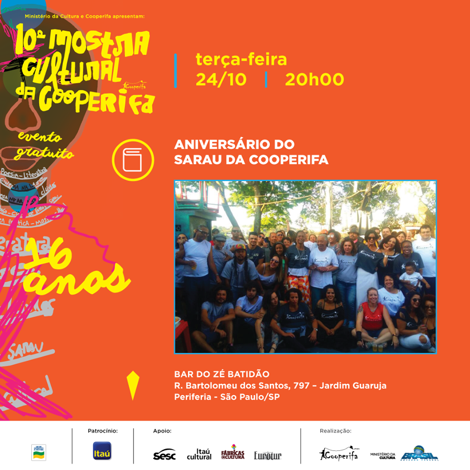 Em outubro de 2017, o Sarau da Cooperifa comemora 16 anos de resistência com uma grande festa, de 21 a 29 de outubro, com uma programação diversa, assim como é a poesia periférica.