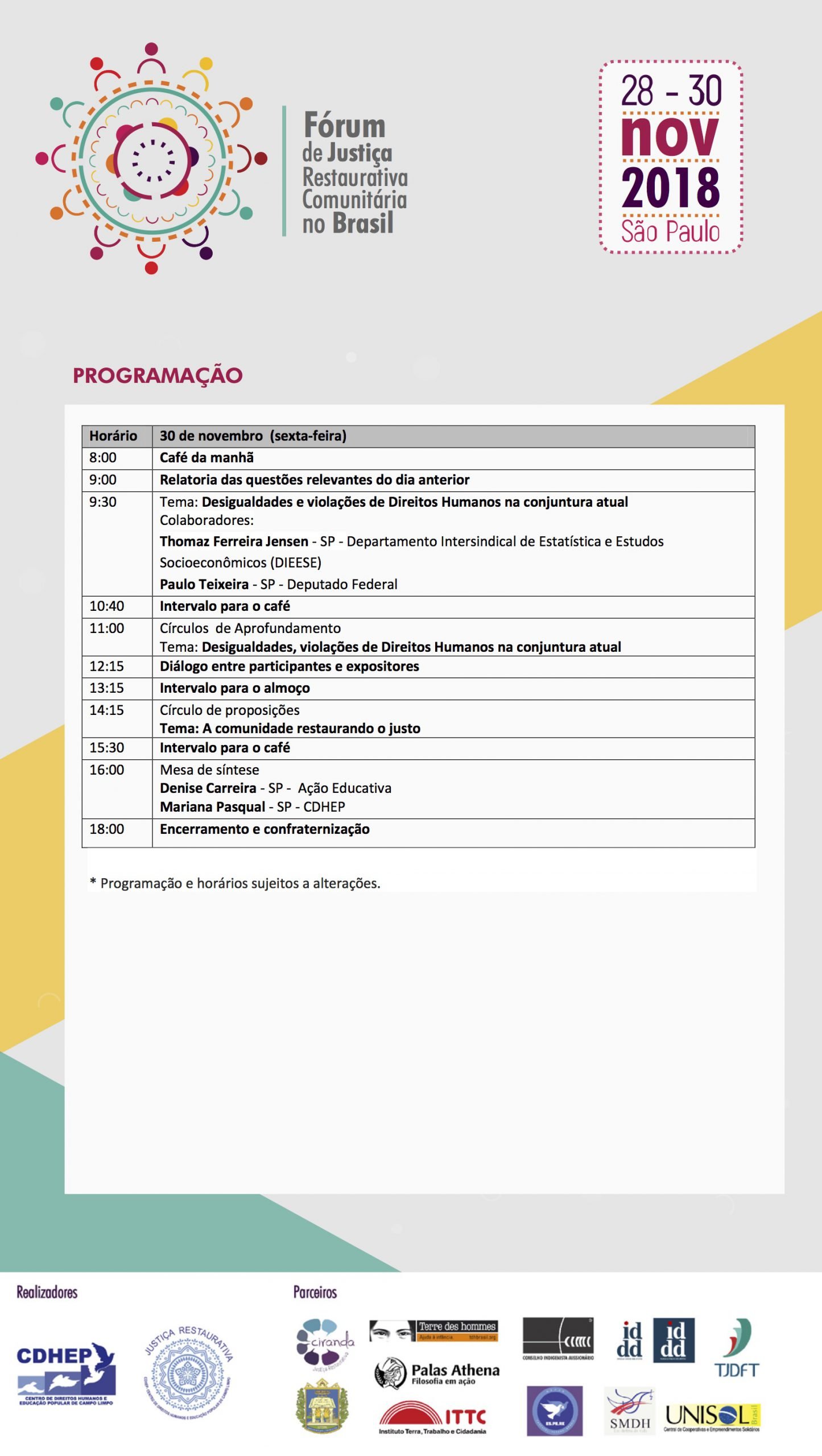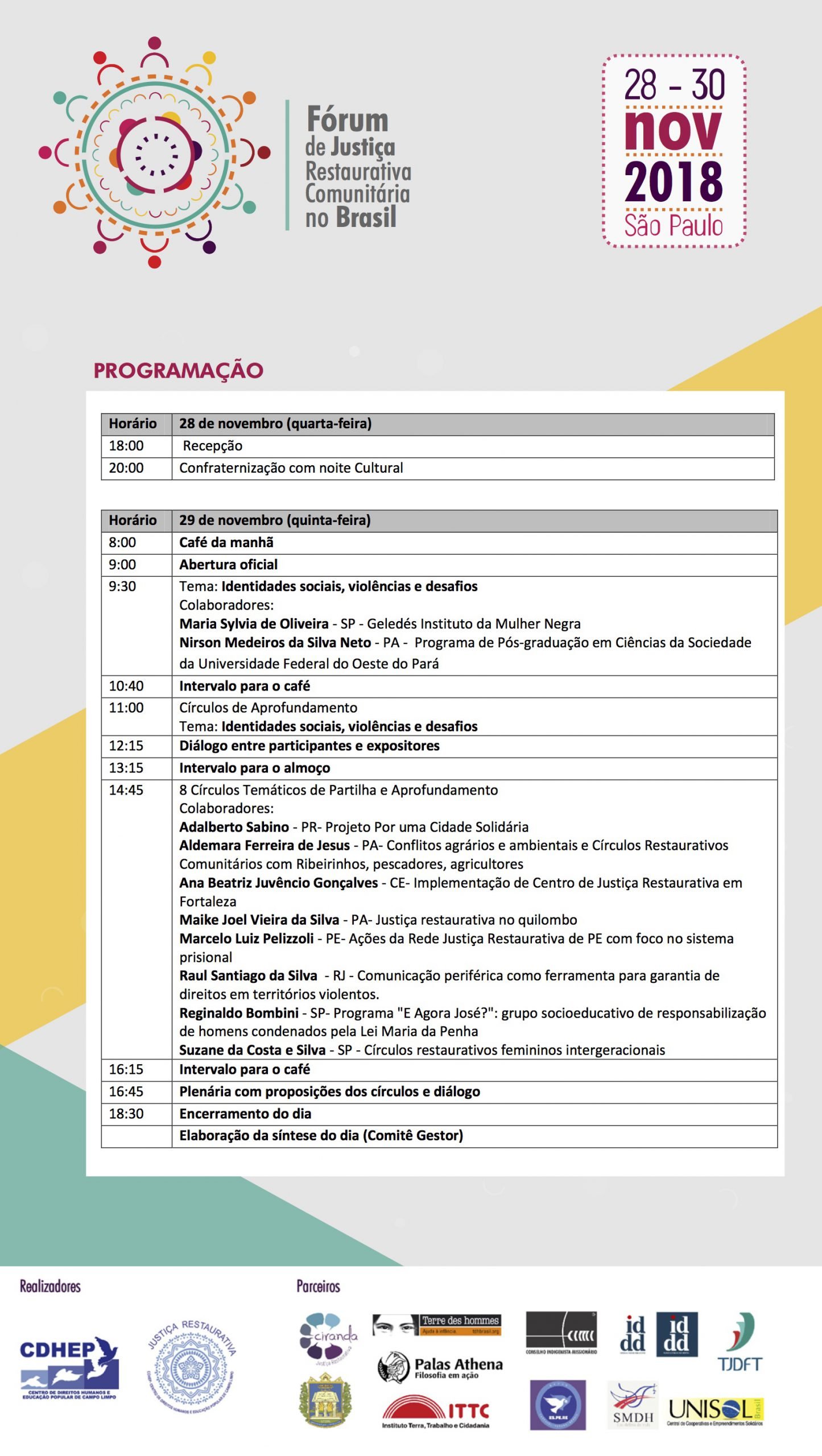 São princípios da Justiça Restaurativa promover o empoderamento, a autonomia e a corresponsabilidade por meio da participação e do diálogo entre sujeitos em situações conflitivas, para construir respostas que atendam às necessidades dos envolvidos. Dentro dessa perspectiva e a partir de vivências na educação popular e articulação da sociedade civil, o CDHEP, juntamente com seus parceiros, mobiliza experiências criativas de diversas regiões do Brasil para fortalecer a comunidade em suas iniciativas de Instaurar Direitos e Restaurar o Justo.