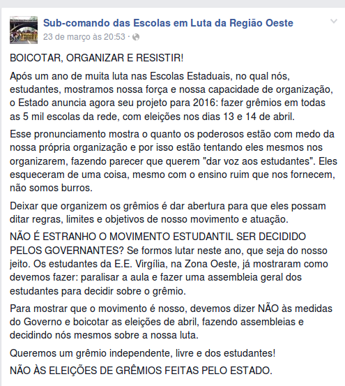 Para 2016, o governo apresentou a proposta de criação de Grêmios em todas as Escolas, afim de estabelecer um diálogo com a juventude, veja aqui. As eleições aconteceriam já nos dias 13 e 14 de abril, mas estudantes relatam que isso não está sendo feito de forma politizada. Para o movimento secundarista, os diretores aliados ao governador querem um grêmio favorável às suas intenções, como mostra recente o comunicado do Sub-comando das Escolas em Luta da Região Oeste: