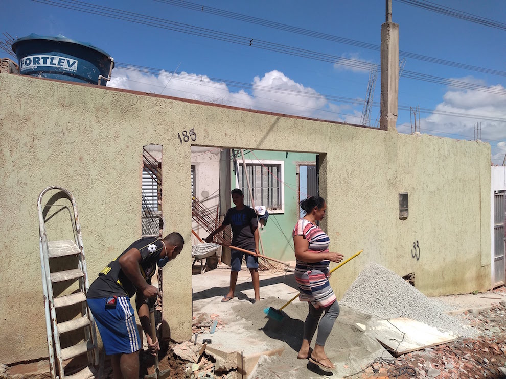Com ajuda de vizinhos, Maria Silva dos Santos se soma ao marido e os quatro filhos adolescentes para fazer a massa que vai usar na reconstrução da casa. Dos seis cômodos, além de dois banheiros e lavanderia, sobraram apenas um quarto e meio e metade da sala.