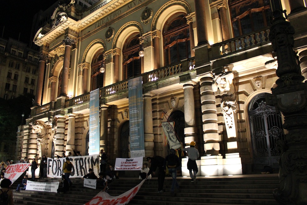 Dali, o grupo seguiu para o Theatro Municipal, equipamento público que detêm 25% da verba para a cultura e é palco de escândalos de corrupção, onde moradores em situação de rua tomaram a palavra no megafone e lembraram a violência contra frequentadores da região conhecida como Cracolândia.