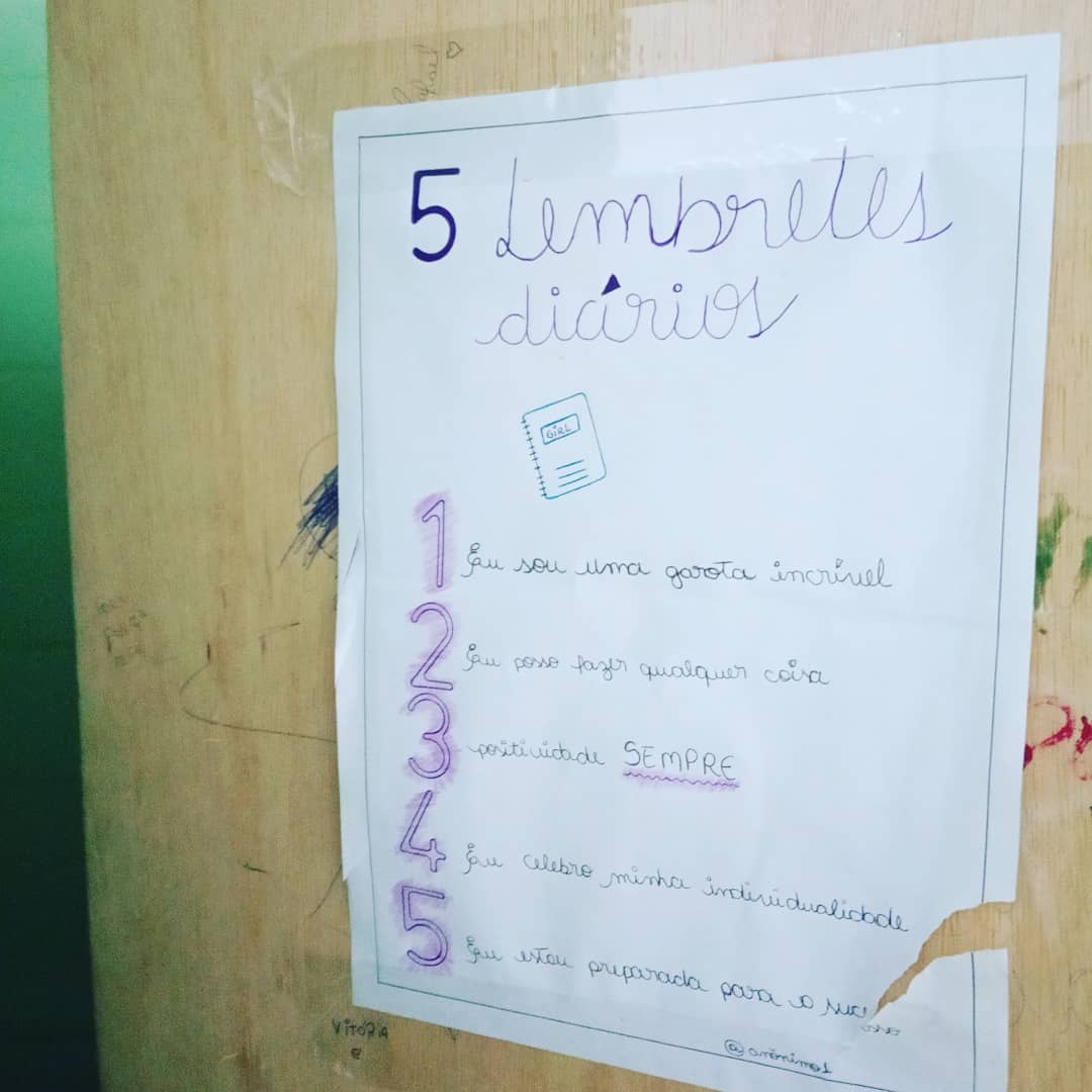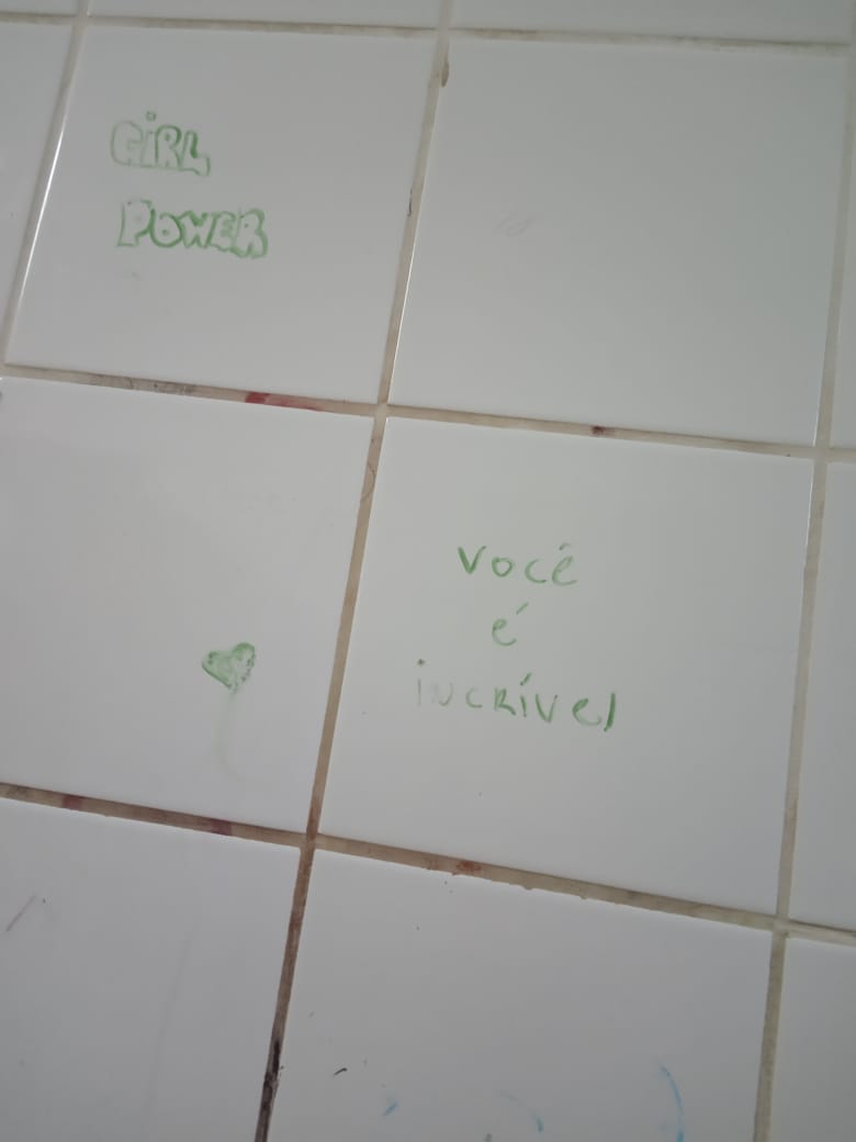 “Mas eu percebo outro movimento nas escolas, que é de tentar criar uma aproximação entre as meninas”, conta Elânia. Em uma oficina na Escola Estadual Joaquim Alvares Cruz, no Barragem (Parelheiros), ela foi ao banheiro novamente. Viu que as paredes ainda têm pixações com xingamentos, mas sobressaem as mensagens positivas. “E isso é maravilhoso, porque quando uma menina olha pra outra e vê que não precisa rivalizar, há a possibilidade de irmandade e cuidado mútuo”, explica.