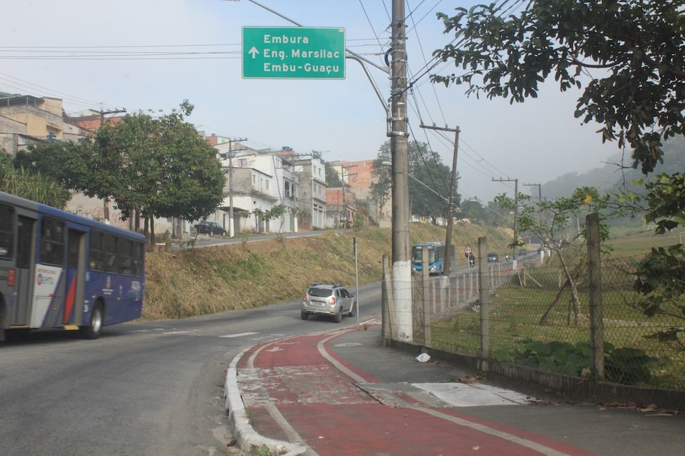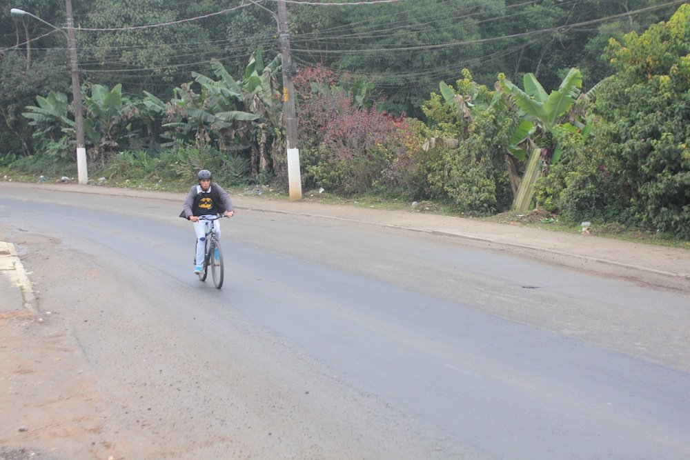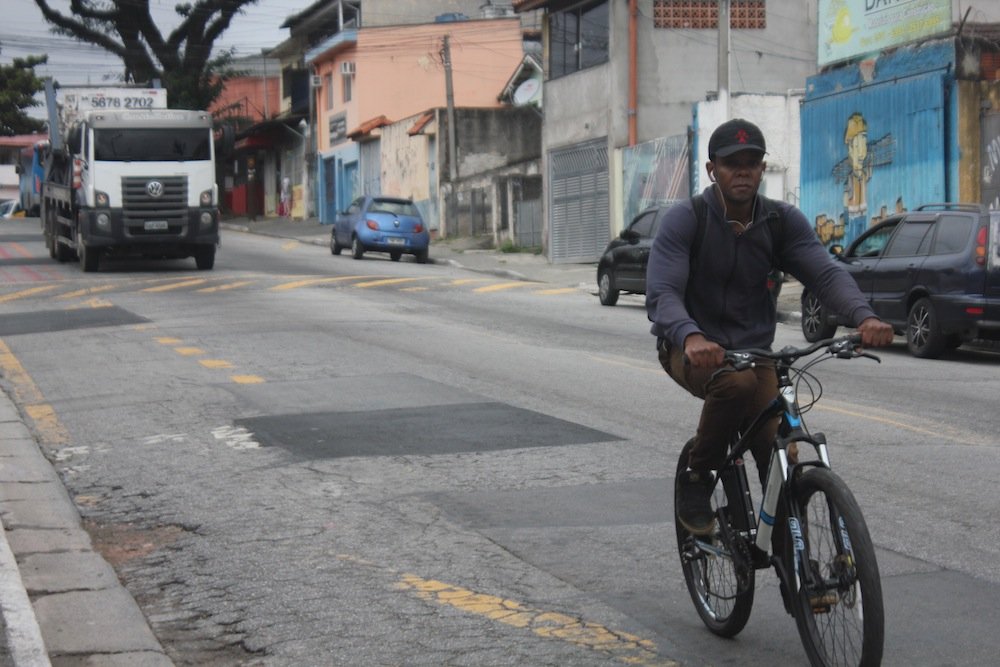 Do Jardim das Fontes, onde ele mora, já foram 20 minutos de pedal até ali – boa parte deles na ciclovia rural da Estrada do Marsilac. Vencida a ladeira, Aparecido se prepara para pedalar mais 20 até o Jardim Silveira – dessa vez, em meio aos carros. “No trânsito, tem que tomar cuidado. As pessoas são muito desatentas”, diz ele, que optou pela bicicleta ao invés do ônibus para economizar R$ 8 por dia com transporte. “De Santo Amaro pra cá, o que der pra fazer eu faço de bicicleta”.