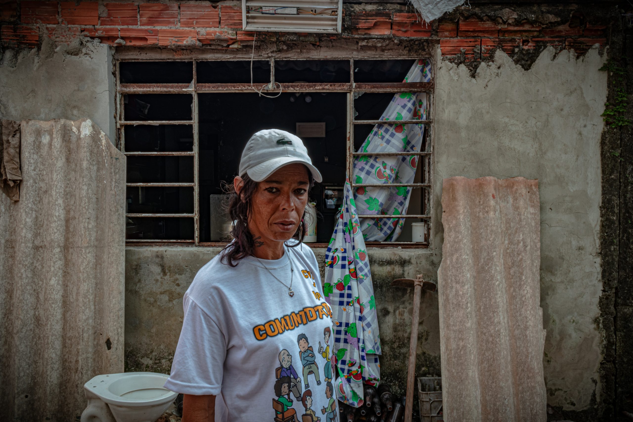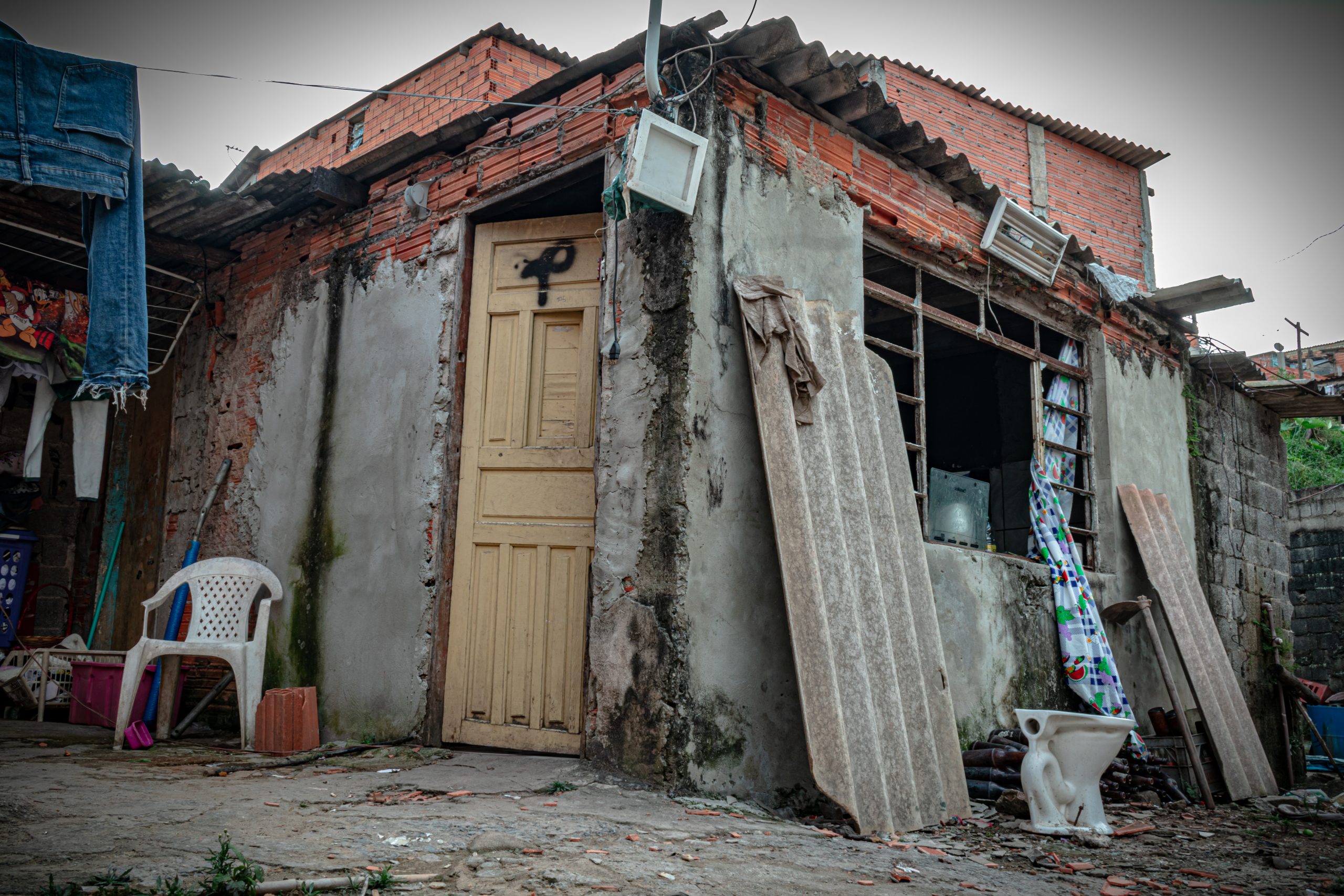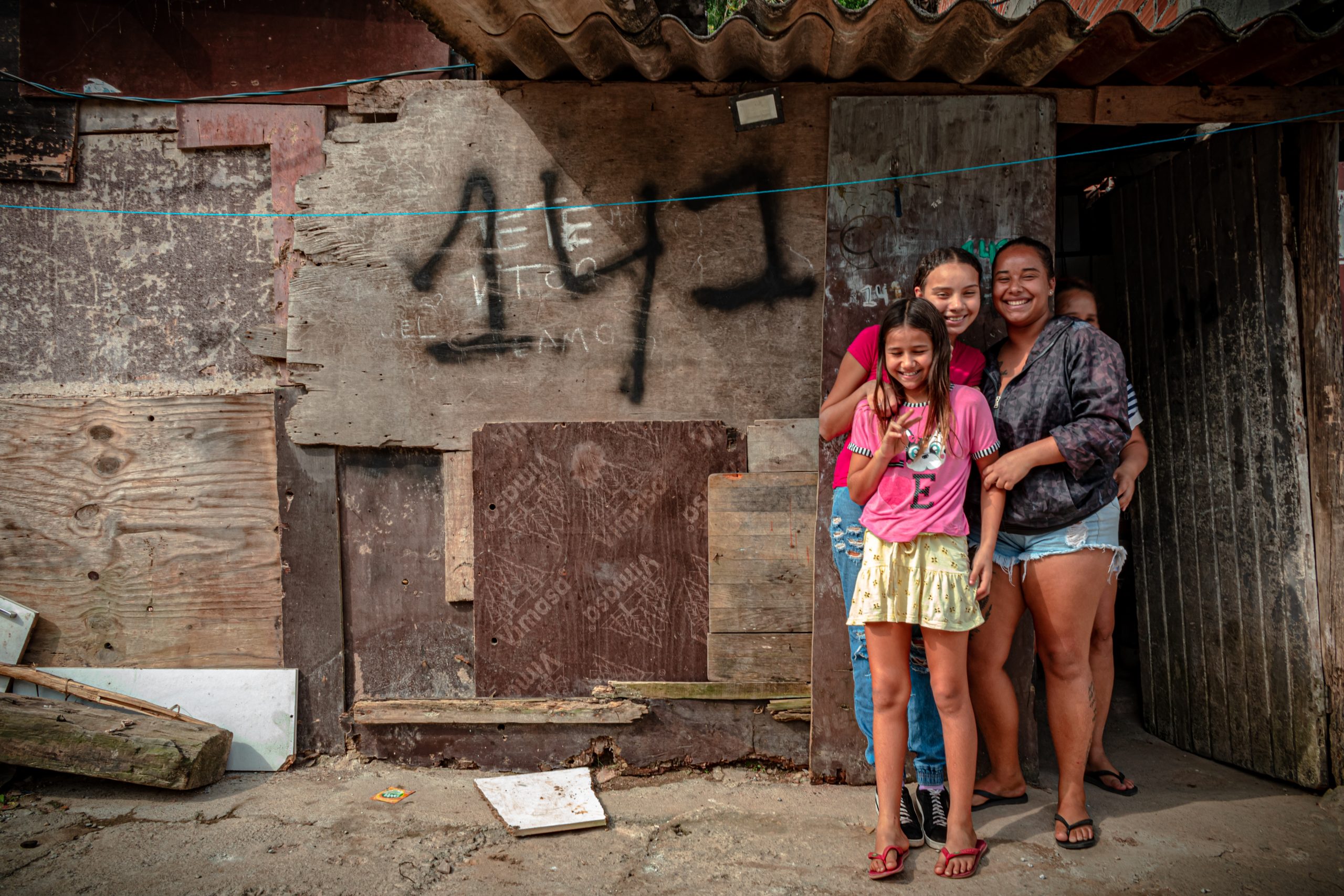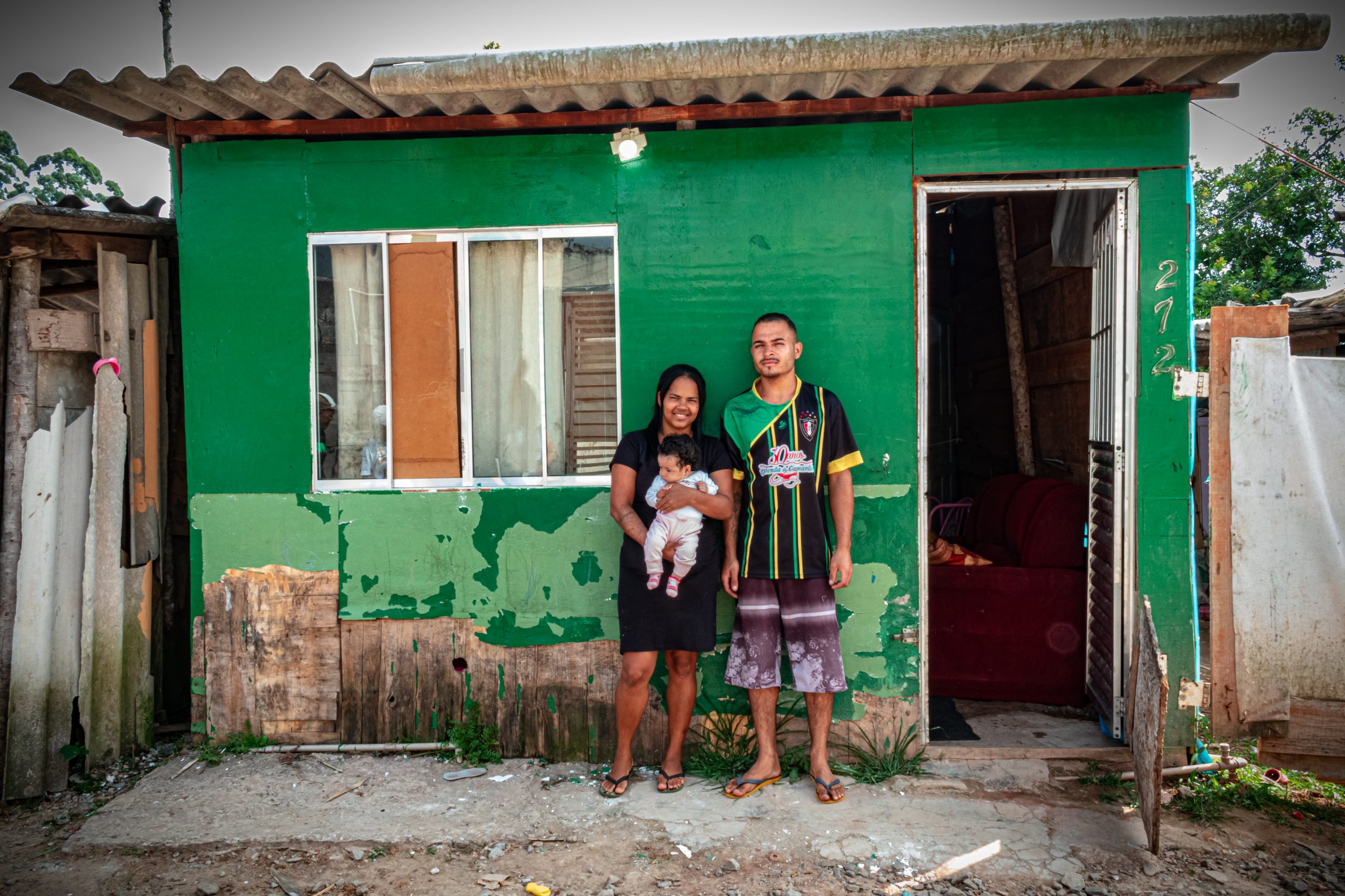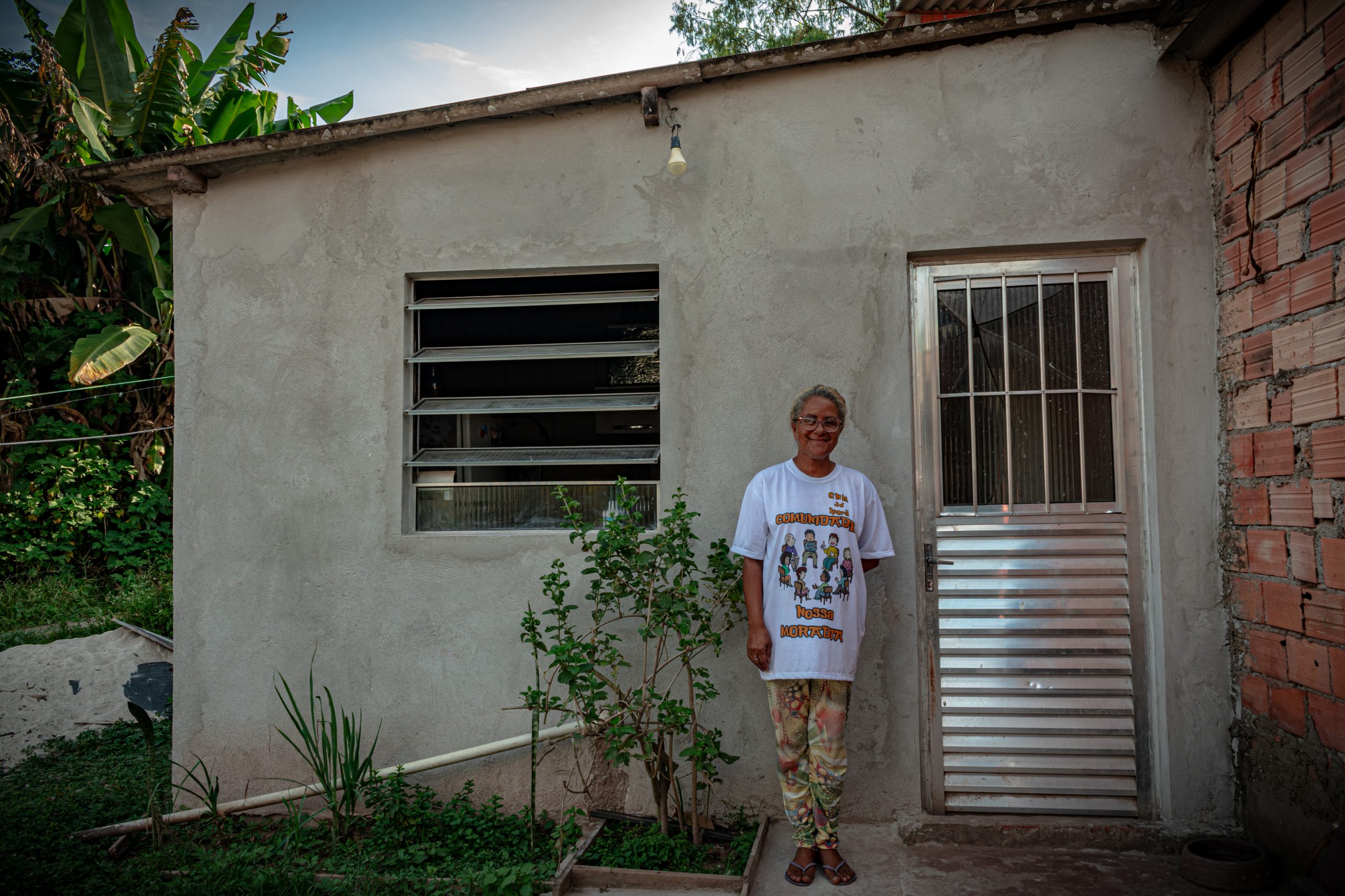A autônoma é mãe solo de 3 e mora há 13 anos no bairro. Quando chegou, fez um barraquinho de madeirite. Foram 9 anos, até subir as paredes de alvenaria, recém rebocadas.