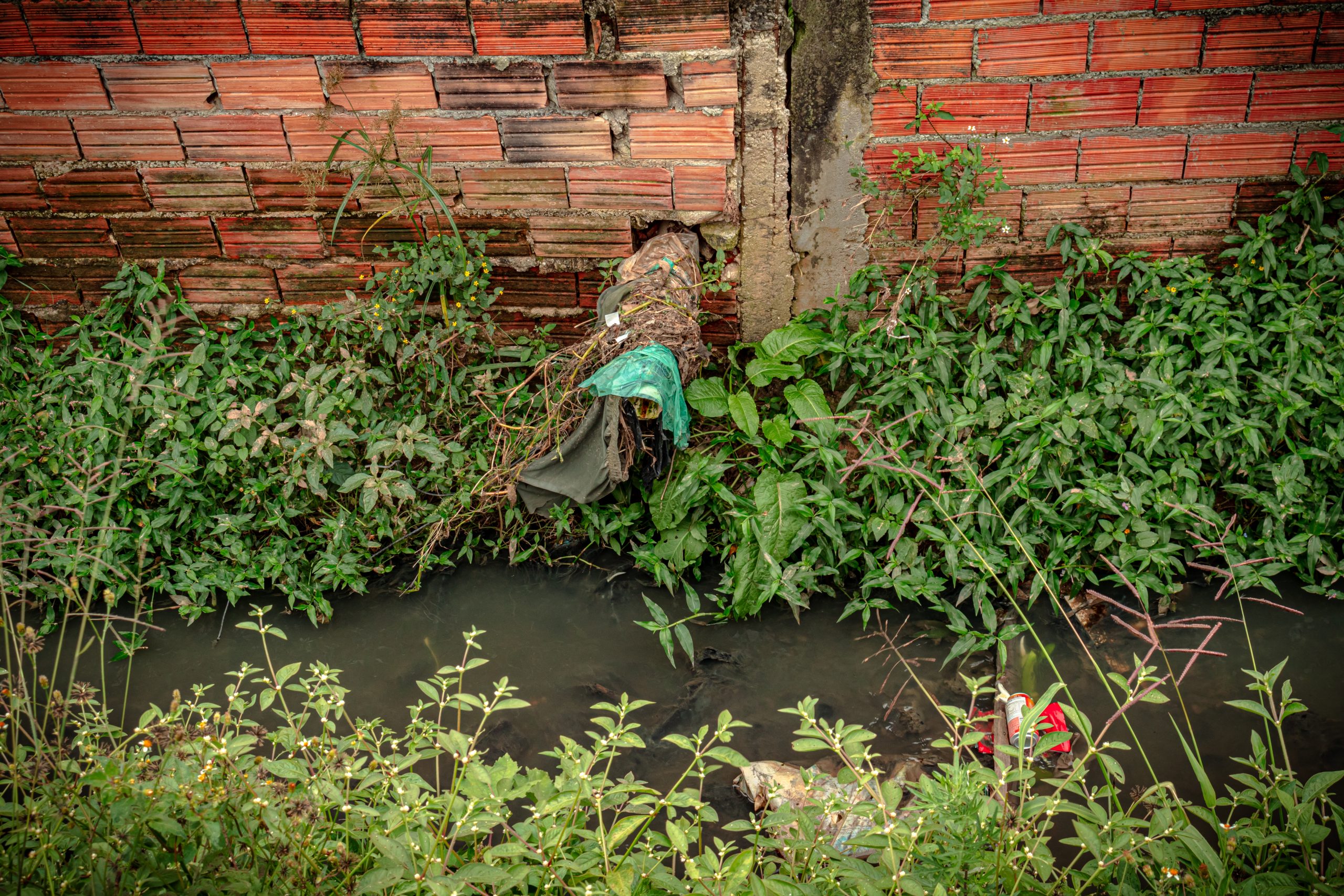 A casa da trabalhadora desempregada Fabiana Bezerra, 36, fica na beira do córrego por onde corre esgoto a céu aberto. Mãe da Maya e da Esther, ela mora há 5 anos na área com as filhas e o marido, também sem trabalho.