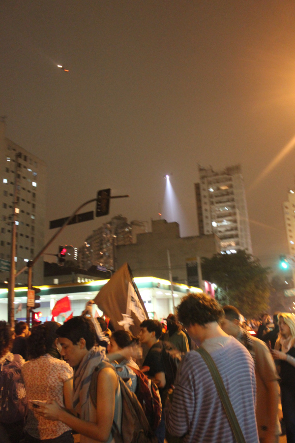 Observados por cima por Datenas, Marcelos Rezendes e pela própria polícia, que sobrevoava a multidão lançando feixes de luz de seu helicóptero, seguimos pela Ipiranga até a rua da Consolação. Quando chegamos ao cruzamento com a rua Maria Antonia, começou a correria. Olhei pra trás e vi alguns policiais da Tropa de Choque se posicionando no outro lado da via. Apesar da multidão cantar “Sem violência” e alguns manifestantes se ajoelharem em frente aos militares com flores nas mãos, demonstrando que ninguém estava ali pra vandalizar, os policiais dispararam granadas e bombas de gás lacrimogêneo. Com o rosto ardendo, fomos socorridos por outras pessoas que carregavam vinagre.